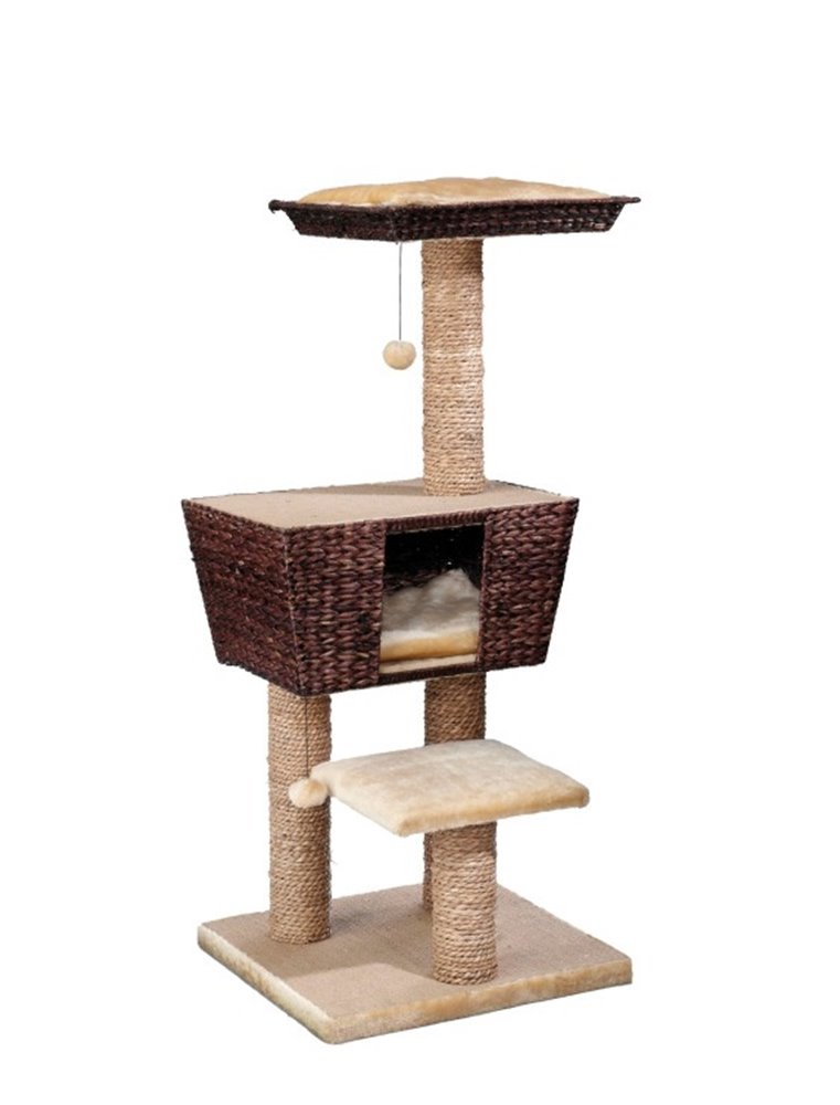 Krabpaal Trend Grenada zal je kat veel plezier bieden door zijn 3 verdiepingen met alles op en eraan. De krabpaal is van het materiaal waterhyacint gemaakt, super sterk en scheurvast. De 2 bengelende speeltjes die aan deze krabpaal bevestigd zijn, nodigen je kat uit te ravotten. Maar tevens kan je kat ook heerlijk relaxen op ??n van de zachte, pluche ligplaatsen of een dutje doen in het kattenhuis. Voor katten is een degelijk krabmeubel noodzakelijk voor het verzorgen van hun nagels en het afbakenen van hun territorium. De jute koord rond de palen is een natuurlijke en zeer robuuste vezel die de kat helpt de schilferige bovenste laag van de nagels te verwijderen.
