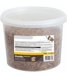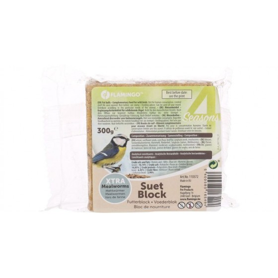 Zonder net: veiliger voor de vogels en milieuvriendelijker. Rijkelijk gevuld met zaden en vetten. Verrijkt met extra meelwormen.