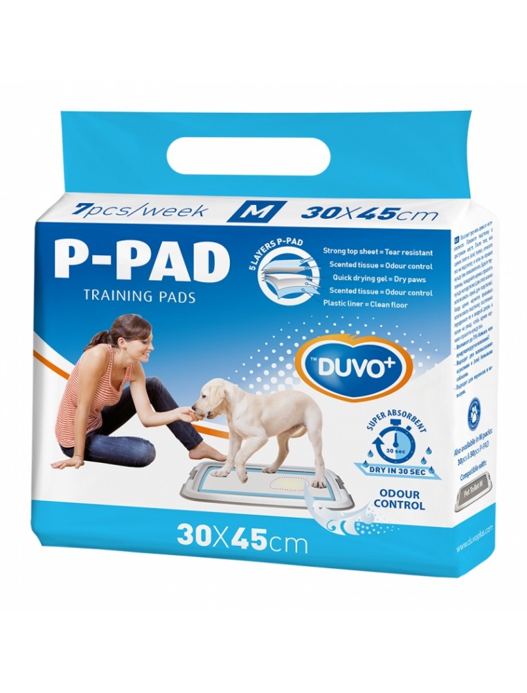 Deze hoog absorberende Duvo+ plasdoek kan niet alleen gebruikt worden voor de zindelijkheidstraining van pups, maar kan ook perfect dienen als toilet voor incontinente honden of honden die lang opgesloten zitten. Helpt om jouw puppy zindelijk te maken: leg de pad op een vaste toegankelijke plaats. Plaats de puppy er op na eten en/of drinken en beloon hem als hij zijn behoefte op de P-Pad heeft gedaan. Om de puppy aan temoedigen hierop zijn behoefte te doen, kan je ook de P-Pad spray gebruiken. Als de puppy de P-Pad correct gebruikt, verschuift je de P-Pad richting deur tot hij buiten ligt en buiten zijn behoefte doet. Ook geschikt voor in reismanden of kennels. De P-Pads bestaan uit 5 lagen. De eerste laag is zeer duurzaam en scheurvast, de 2de en 4de laag verwijderen snel onaangename geuren, de middelste laag zet vloeistof snel om in gel en zorgt voor droge pootjes en de 5de laag gemaakt uit stevige kunststof garandeert een droge en propere vloer zonder lekken., Afmeting: 15,5x4x12,5