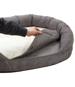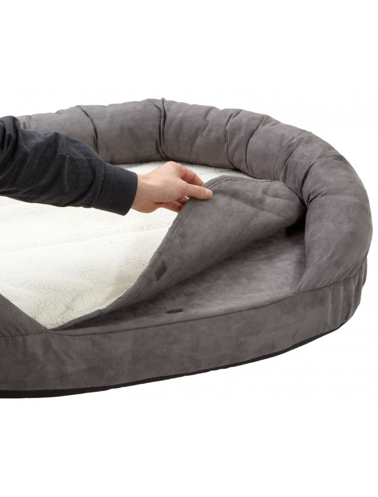 Ovaal ligbed met een speciale vulling van orthopedisch traagschuim. Traagschuim is een materiaal dat zich aanpast aan de lichaamsvorm en zorgt voor optimale drukverlaging op de wervelkolom en de gewrichten. Traagschuim komt altijd terug in z’n originele vorm. De hoes is afneembaar en kan gewassen worden op 30°C. Met uitneembare ligdeken die is bevestigd met klittenband. Met antislip onderkant.