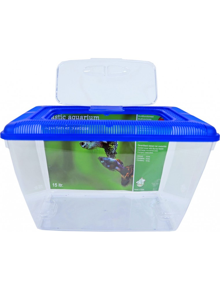Gebr. de Boon BV plastic aquarium met een blauwe plastic afdekkap waardoor de vissen er niet uit kunnen springen met een handig transparant voederklepje in de afdekkap. Verkrijgbaar in meerdere maten.