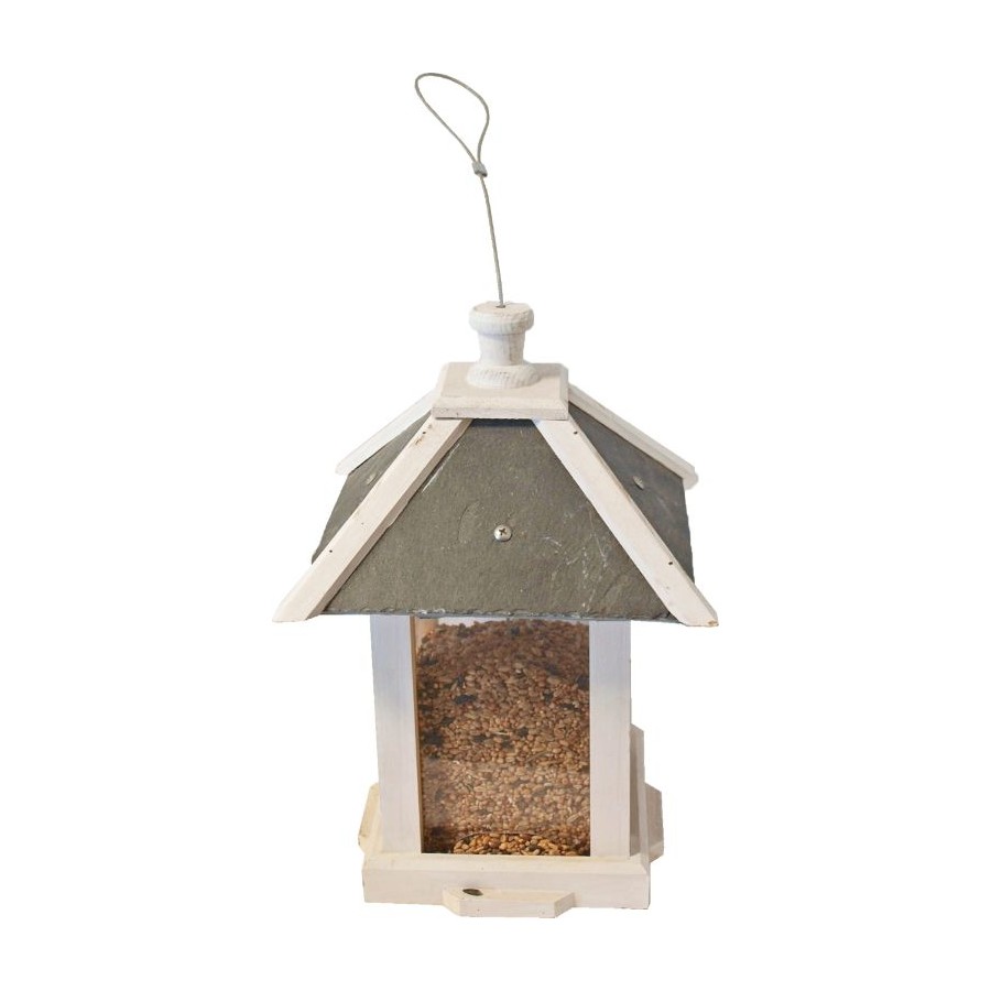 Voedersilo wit/leisteen vierkant hangbaar 30 cm met 4-zijdig dak is een mooie voedersilo die voor een mooie aankleding van uw tuin zorgt. Deze voedersilo is wit met een 4-zijdig dak afgewerkt met leisteen en op te hangen aan een metalen lus. Het is een ideale voederplek voor (kleine) vogels.
