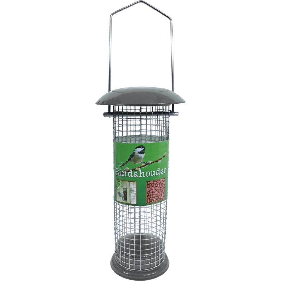 Metalen pindahouder zilverkleur. Pinda’s zijn een eiwitrijke en vetrijke voeding die door vele vogels graag gegeten wordt. Om ‘pindarovers’ zoals gaaien geen kans te geven en het voer langer vers te houden is deze pindahouder een uitkomst. Verkrijgbaar in 2 verschillende maten.