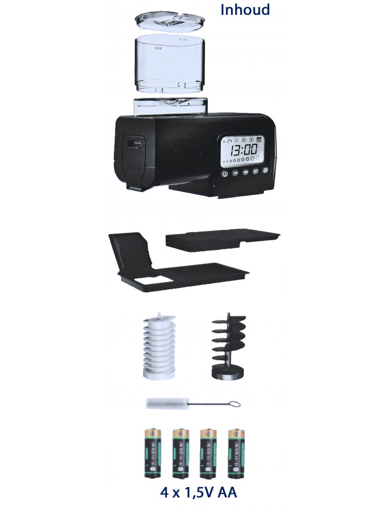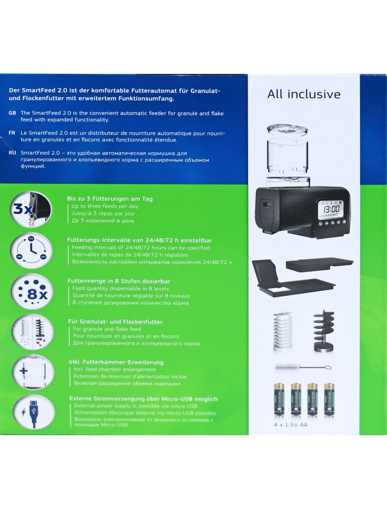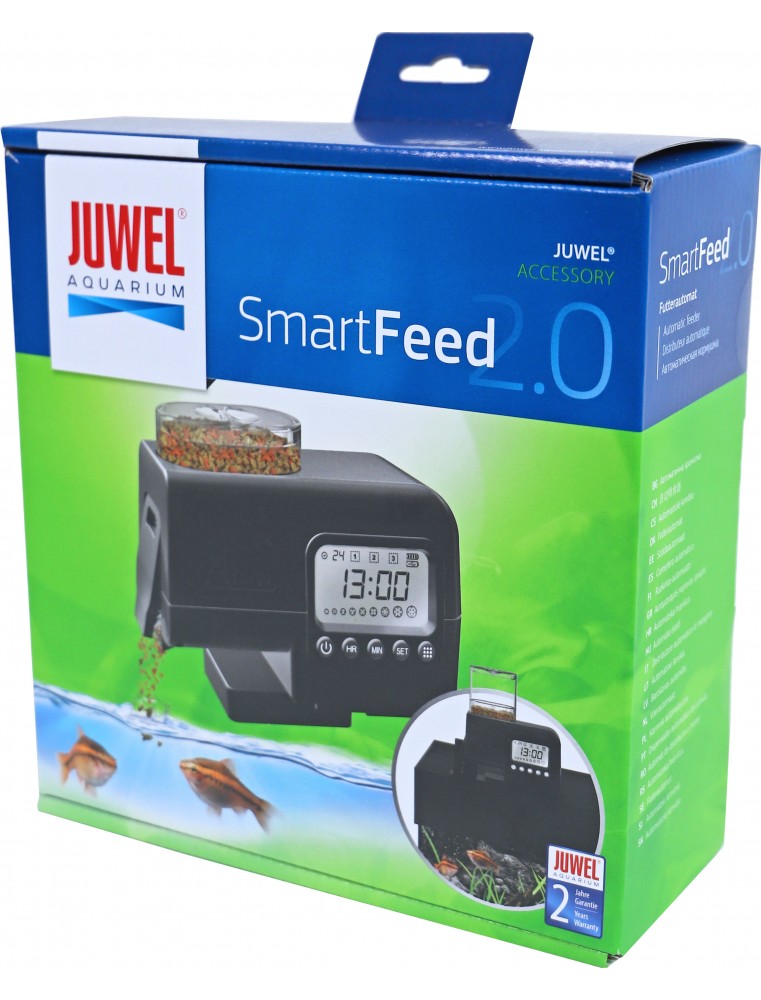 De Juwel SmartFeed 2.0 voerautomaat is de voerautomaat van topklasse voor ieder JUWEL-aquarium. Dankzij verwisselbare voertransportschroeven is hij geschikt voor zowel korrel- als vlokkenvoer. De voederautomaat is instelbaar met intervallen van 24, 48 of 72 uur. Daarbij is de hoeveelheid voer in 8 standen naar keuze te doseren. Met het grote display is het programmeren van het voeren comfortabel en goed leesbaar. Het voervolume is dankzij het bijgevoegde opzetstuk voor de voerkamer uit te breiden. Ideaal voor bij langere afwezigheid.
