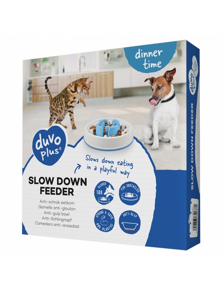 De slow down feeder van duvoplus zorgt voor een rustiger eetpatroon en laat je hond of kat op een speelse manier eten. Door het labyrint aan de binnenzijde van de eetkom doet je huisdier 10x langer over zijn eten en kan schrokken voorkomen worden. Door deze uitdagende manier van eten krijgt jouw hond of kat sneller een verzadigd gevoel. Minder snel eten verbetert de algemene gezondheid en helpt maagtorsie, winderigheid en overgewicht voorkomen. De stevige voerbak is ook voorzien van anti-slip rand om kantelen en glijden te verminderen., Kleur: Blauw, Afmeting: 28,5x28,5x7cm