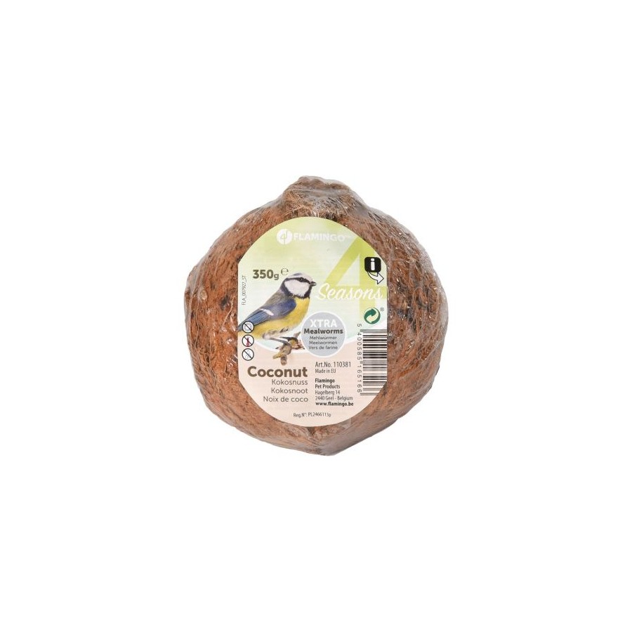 Flamingo voederkokosnoot met 3 gaten en meelwormen 350g