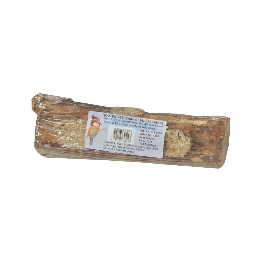 Met deze houten gevulde vetstaaf zult u de buitenvogels een groot plezier doen. De houten vetstaaf is gevuld met vet en door de 3 gaten zullen de vogels er makkelijk en met veel plezier van kunnen genieten.